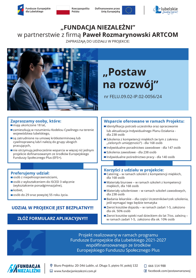 Miejski Urząd Pracy w Lublinie informuje, że Fundacja Niezależni w partnerstwie z firmą Paweł Rozmarynowski ARTCOM organizuje projekt „Postaw na rozwój”.
