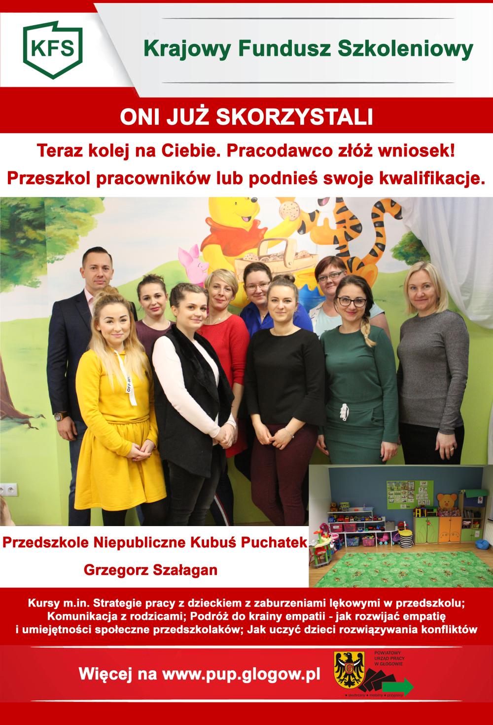 PRACODAWCO PODNIEŚ SWOJE KWALIFIKACJE LUB PRZESZKOL PRACOWNIKÓW Z PIENIĘDZY URZĘDU PRACY. Z KFS dotychczas (od 2014 r.) skorzystało 65 pracodawców, a przeszkoliliśmy 899 osób, Dofinansowania otrzymali m.in: Komunikacja Miejska w Głogowie, Przedszkole Niepubliczne Kubuś Puchatek, Studio Kosmetyczne SATIN, Przedsiębiorstwo Antrans, E-Towers Famaba S.A., NTI, Fuego Bar, Praktyka Lekarska B. Bobójć