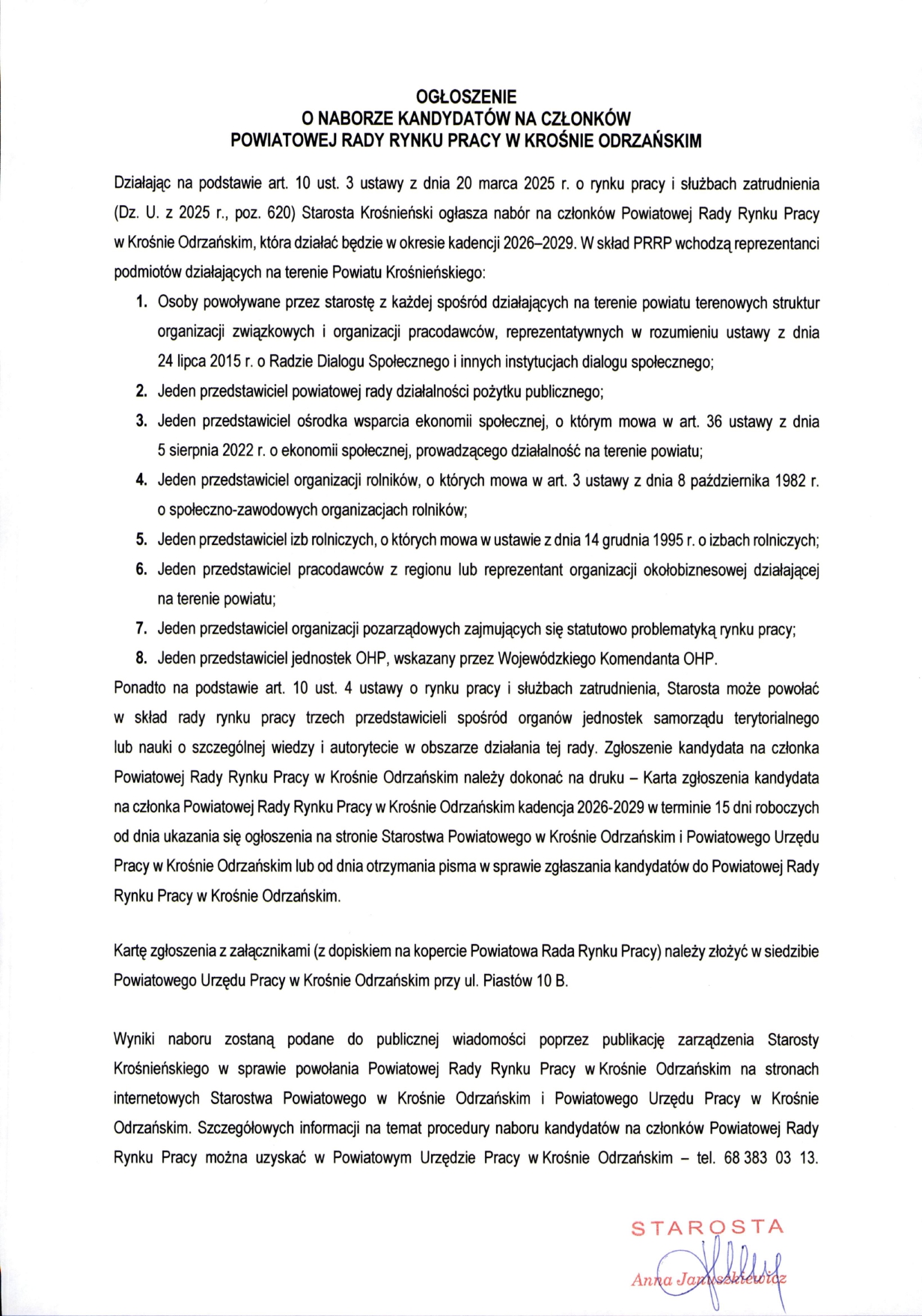 Ogłoszenie o naborze kandydatów na członków Powiatowej Rady Rynku Pracy w Krośnie Odrzańskim - Powiatowy Urząd Pracy w Krośnie Odrzańskim