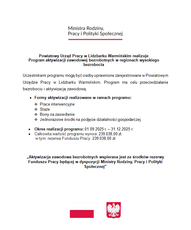 1. Powiatowy Urząd Pracy w Lidzbarku Warmińskim ogłasza nabór wniosków w trybie konkursowym, w terminie od dnia 04.09.2025 r. do dnia 11.09.2025 r., na: