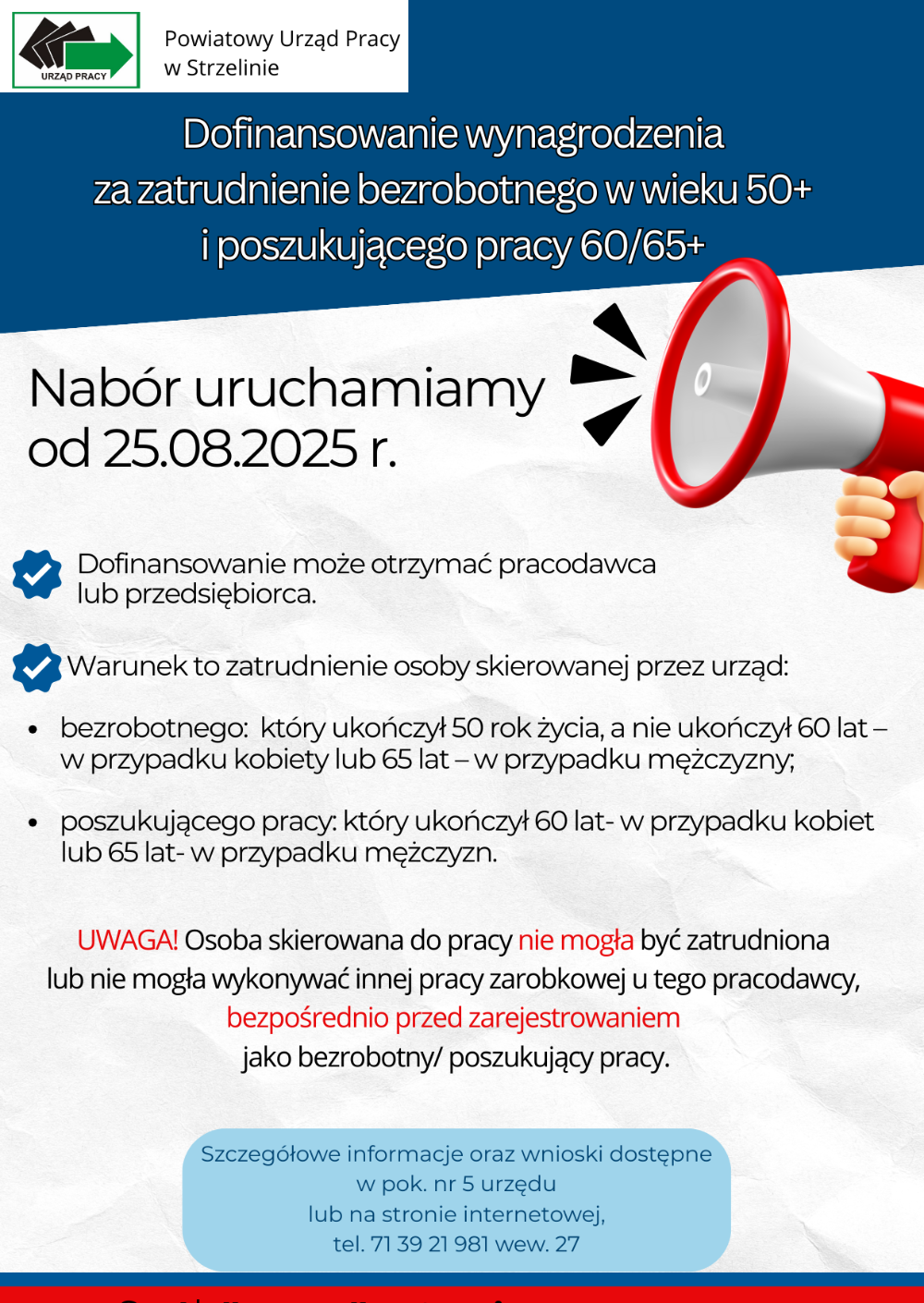 Nabór na Dofinansowanie wynagrodzenia za zatrudnienie bezrobotnego w wieku 50+